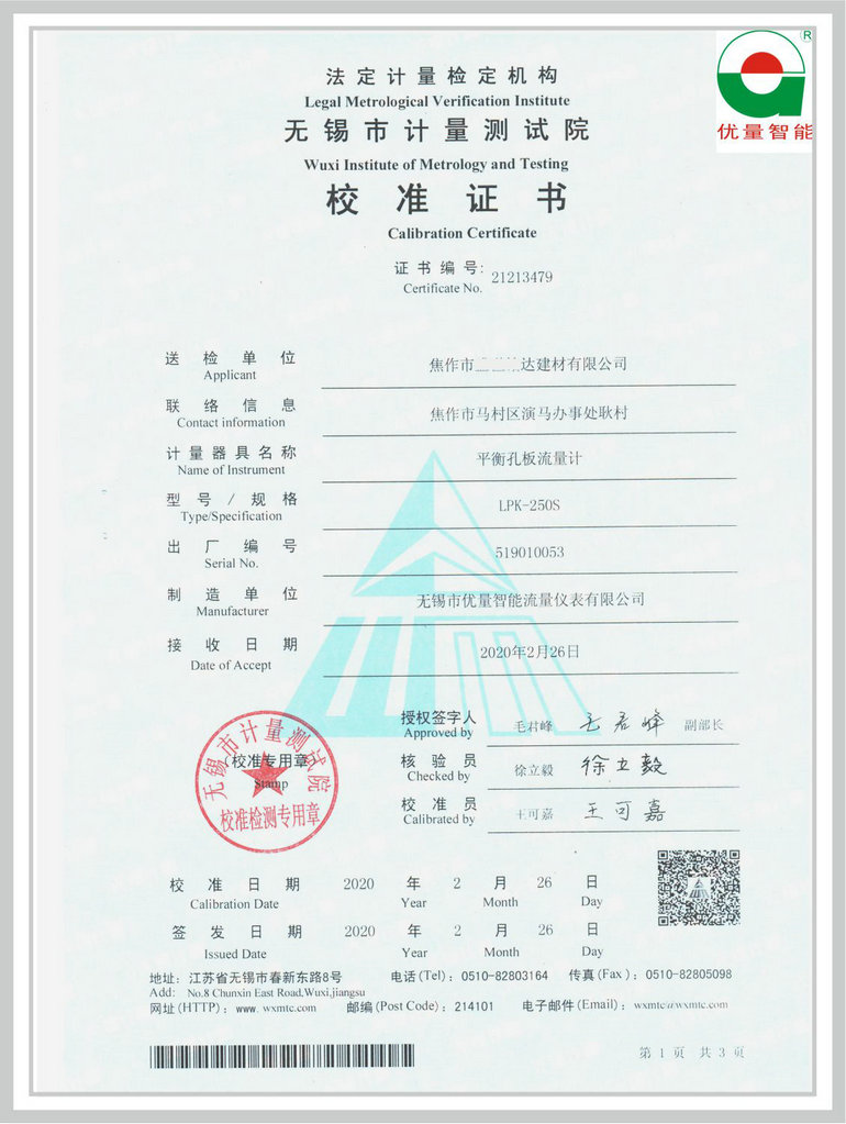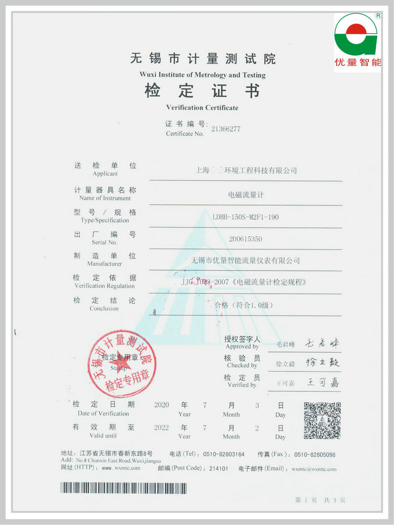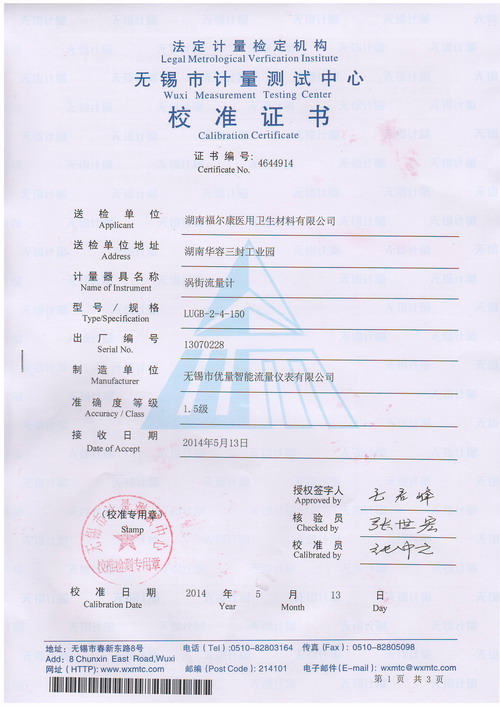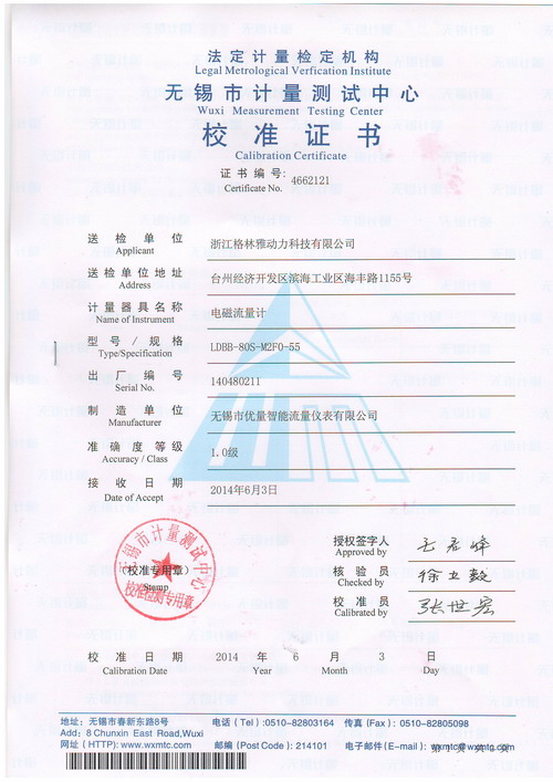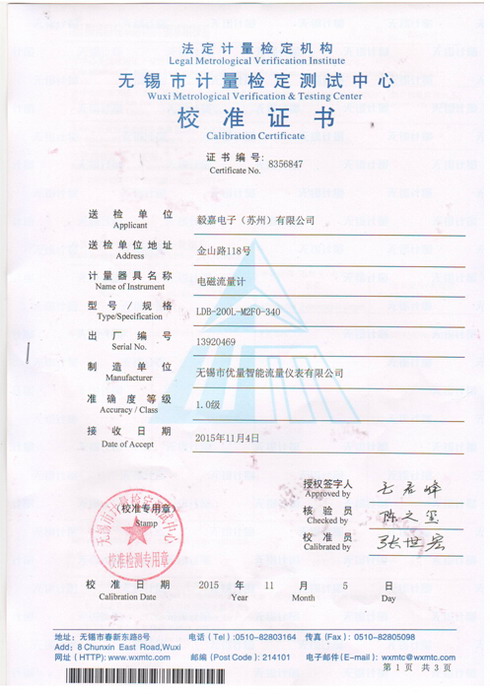 電磁流量計/ 無錫市計量測試中心頒發/ 校準證書、檢定證書