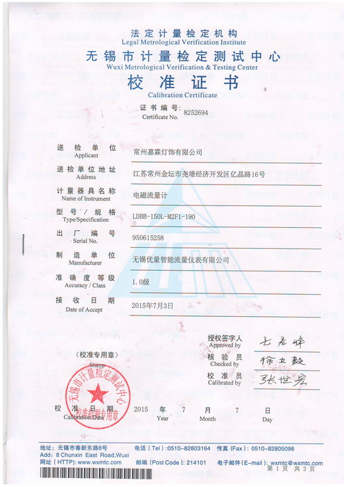 電磁流量計/ 無錫市計量測試中心頒發/ 校準證書、檢定證書 |