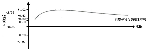 設(shè)計的調(diào)整齒輪是38/35,檢驗誤差時若示值大與真值,即出現(xiàn)“+”誤差。例如+1.02~+0.3,見誤差調(diào)整圖,查調(diào)整齒輪表(見下圖),得知選用41/38調(diào)整齒輪比較合適,這樣誤差曲線的原點便由38/35 調(diào)整齒輪對應的零位上移至41/38調(diào)整齒輪對應的+0.63的位置。因而誤差曲線便處于新的坐標系中,即誤差調(diào)整至+0.39~-0.33的范圍內(nèi),而流量計的準確度達到要求。
